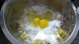4- Espere esfriar e, num recipiente, adicione a farinha, o ovo, a manteiga (Pode aquecer no microondas para derreter) e o sal.