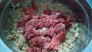 4- Num recipiente grande, coloque o trigo, a mistura do processador e a carne. Misture bem.
