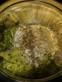 5- Para o recheio, misture num recipiente todos os ingredientes do recheio (abobrinhas raladas, ovos, creme de leite, farinha de trigo, queijo ralado, orégano, sal e pimenta do reino). Dica: o queijo gouda pode ser substituído por outros queijos como gruyere, emental e até queijo prato.