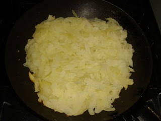 4) Coloque um pouco de manteiga na frigideira e, quando derreter, coloque uma quantidade suficiente de batata para cobrir o fundo da frigideira. IMPORTANTE: Não pressione muito a batata para não trasnformá-la num purê!