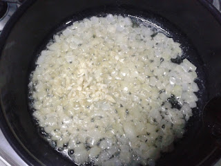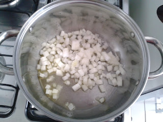 3- Corte a cebola em cubinhos e rofogue-a (até ficar transparente) com um pouco de azeite.