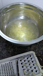 3- Rale as duas batatas restantes com um ralador ou mandolin no recipiente com água e limão (O suco de limão vai prevenir que a batata escureça).