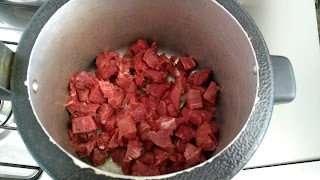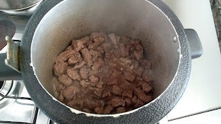 6- Leve a panela de pressão ao fogo, coloque um fio de azeite e doure o filet mignon. Deve ficar bem douradinho (a água deve ter quase evaporada completamente).