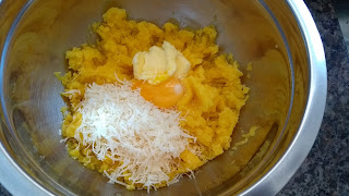 9- Enquanto o ragu fica na pressão e com a mandioquinha já em temperatura ambiente, adicione a gema de ovo, a manteiga e o queijo parmesão. Misture bem.