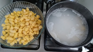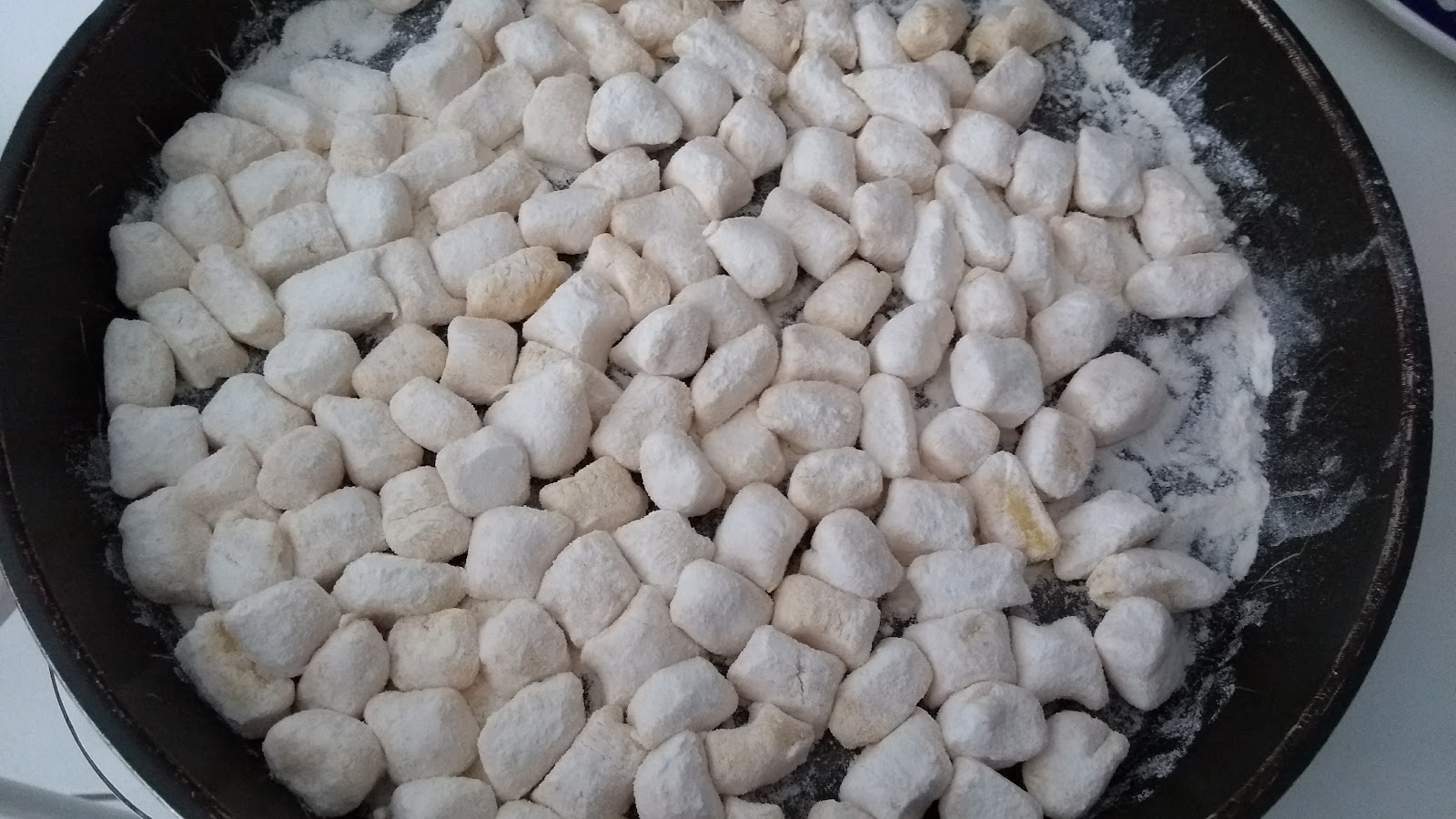 14- Leve uma panela ao fogo com água e uma pitada de sal. Coloque o nhoque aos poucos e retire quando começar a flutuar. Coloque num recipiente e regue com azeite para não grudar.