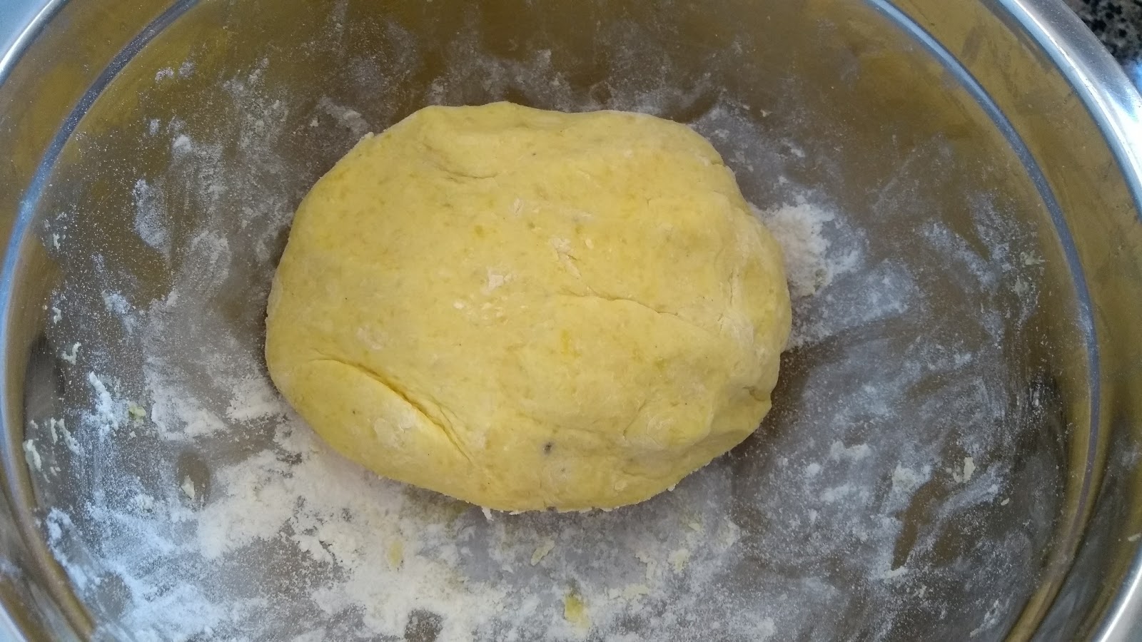 11- Junte a farinha aos poucos até dar o ponto (uniforme e soltando dos dedos). Pode ser preciso usar mais farinha.