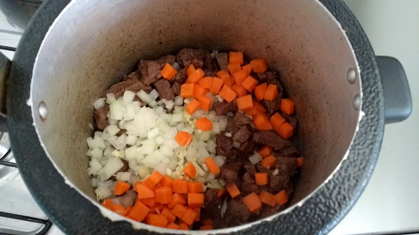 7- Adicione o alho, a cebola e a cenoura. Refogue.
