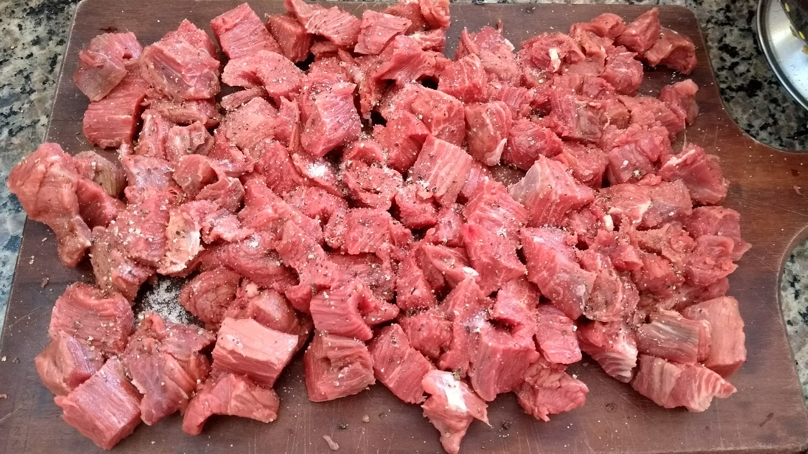 5- Corte o filet mignon em cubos e tempere com sal e pimenta do reino.
