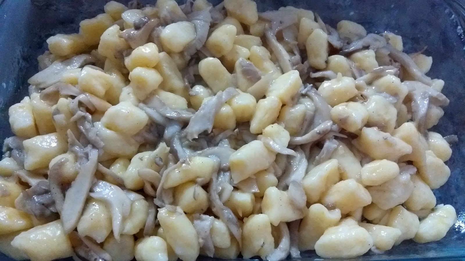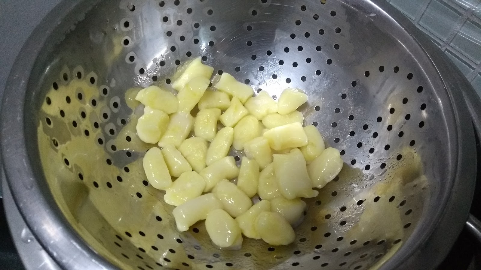 14- Leve uma panela ao fogo com água e uma pitada de sal. Coloque o nhoque aos poucos e retire quando começar a flutuar. Coloque num recipiente e regue com azeite para não grudar.