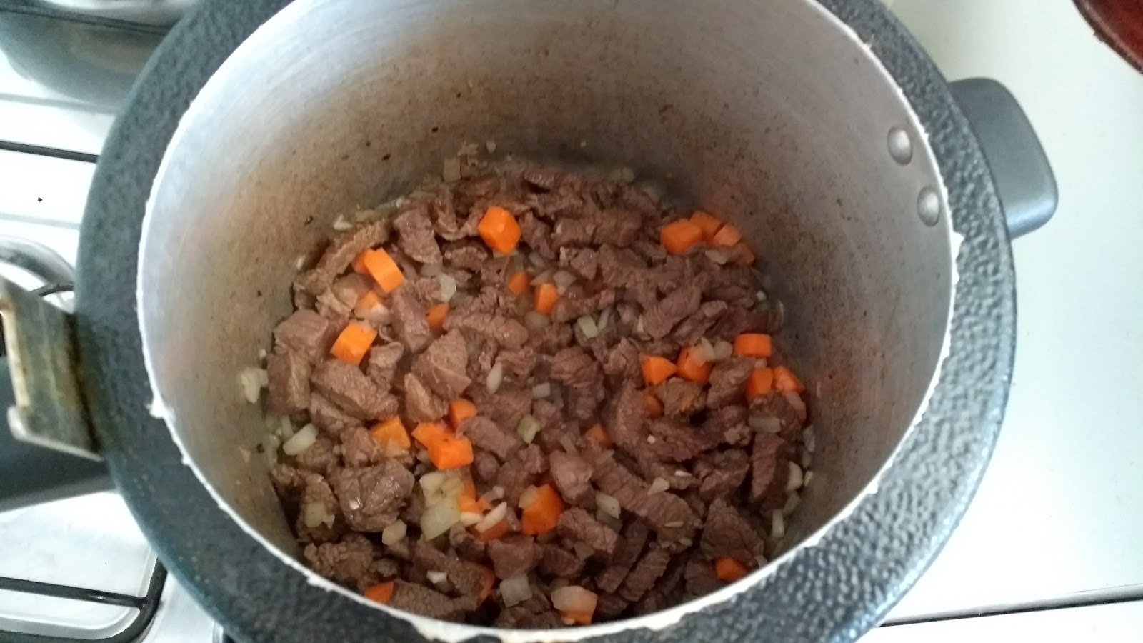 6- Leve a panela de pressão ao fogo, coloque um fio de azeite e doure o filet mignon. Deve ficar bem douradinho (a água deve ter quase evaporada completamente).