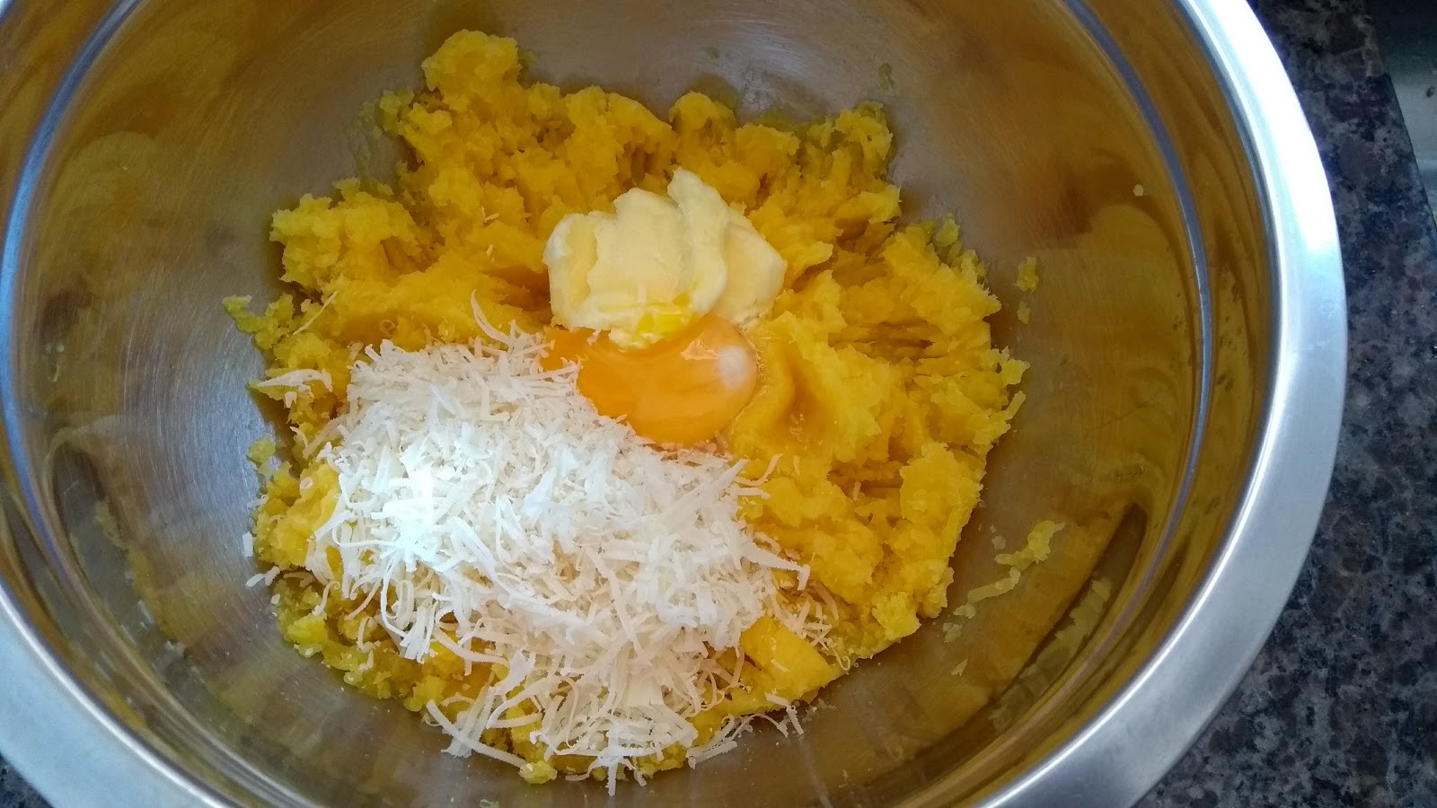 9- Enquanto o ragu fica na pressão e com a mandioquinha já em temperatura ambiente, adicione a gema de ovo, a manteiga e o queijo parmesão. Misture bem.