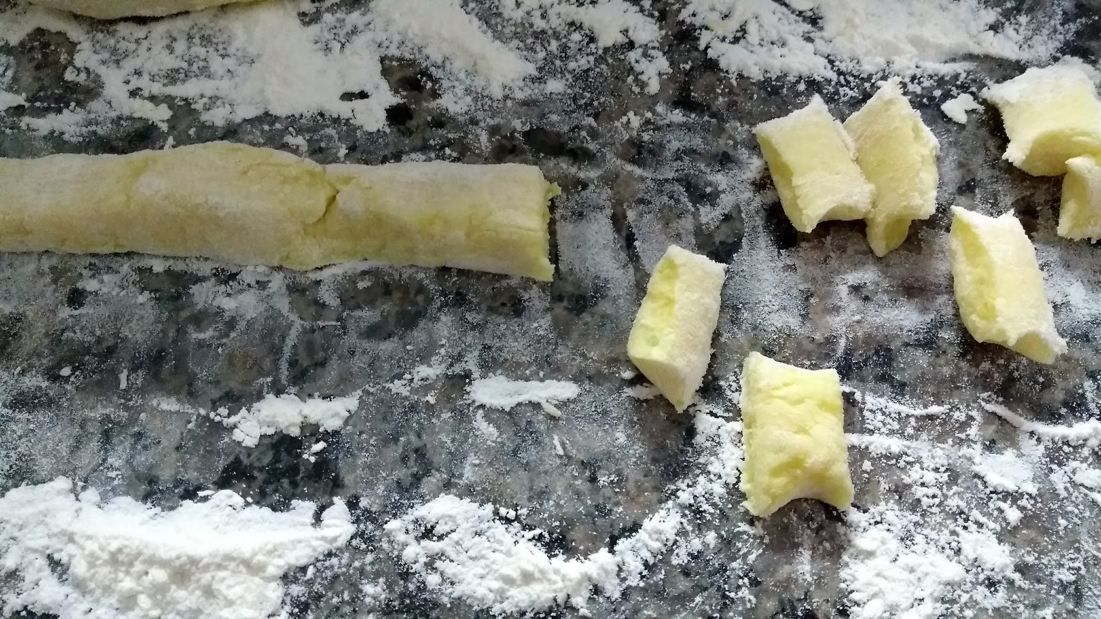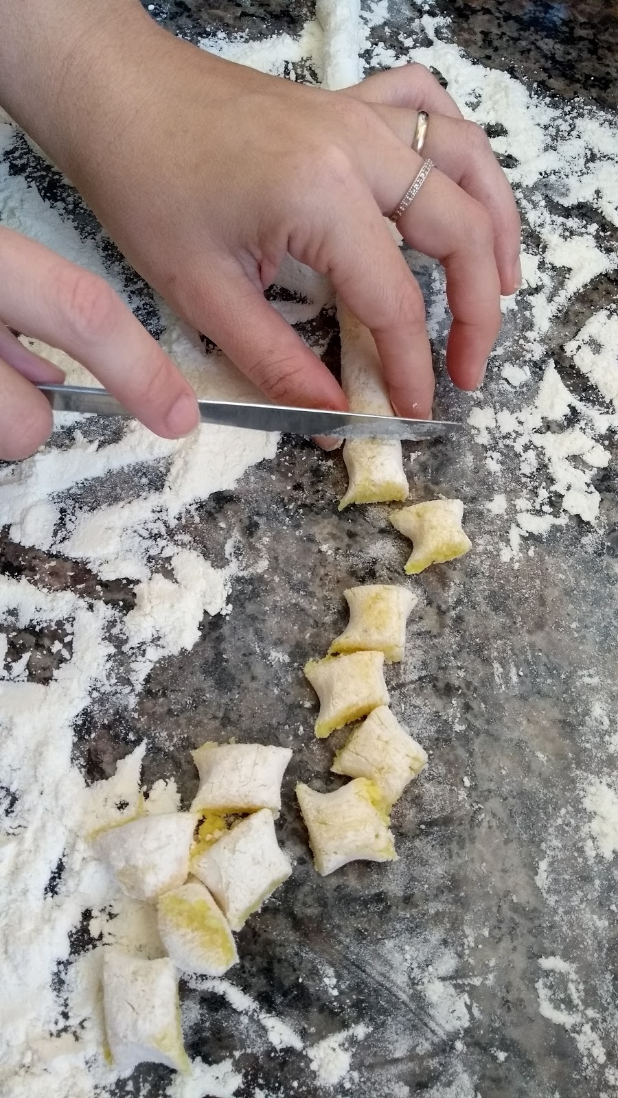 12- Numa superfície com farinha, pegue pequenos pedaços da massa, faço "rolinhos" e corte as "bolinhas" com a ajuda de uma faca.