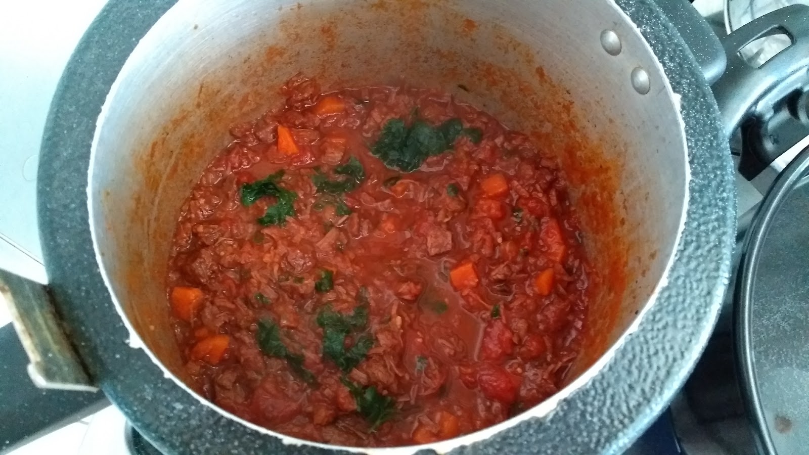 8- Coloque o tomate pelado, o vinho e a folha de louro. Adicione uma pitada de sal, mexa bem e tampe. Deixe cozinhando na pressão por cerca de 40 minutos (Comece a contar o tempo após o "barulinho" começar).