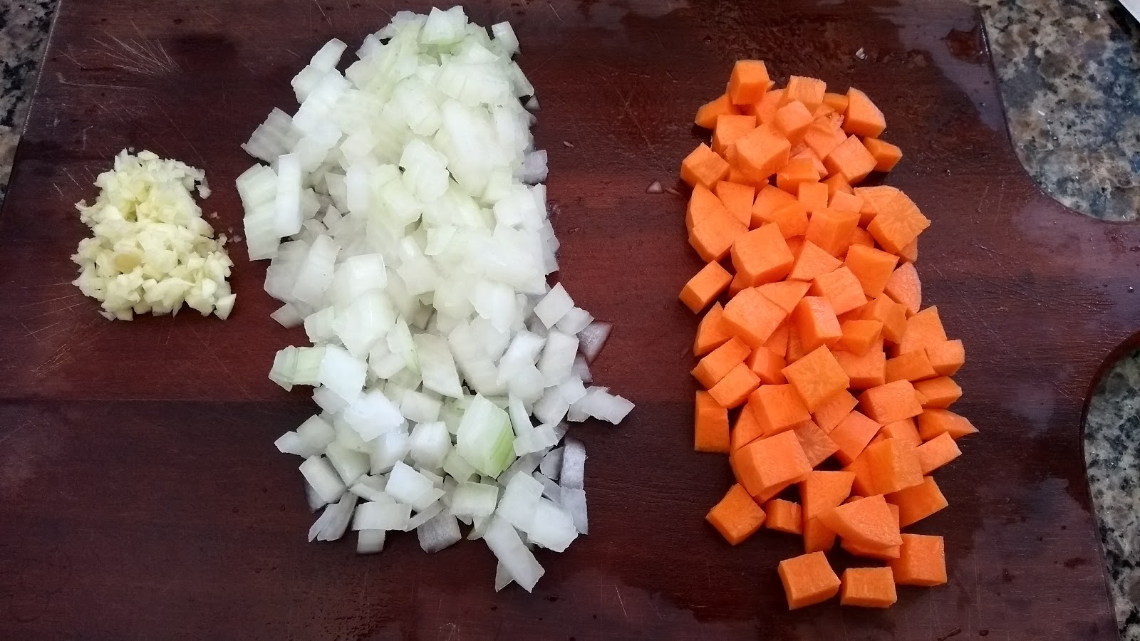 4- Para iniciar o preparo do ragu, pique o alho, corte a cebola e a cenoura em cubos pequenos.