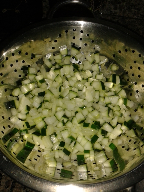 3- Junte numa travessa o pepino, a cebola e o sal. Misture bem.