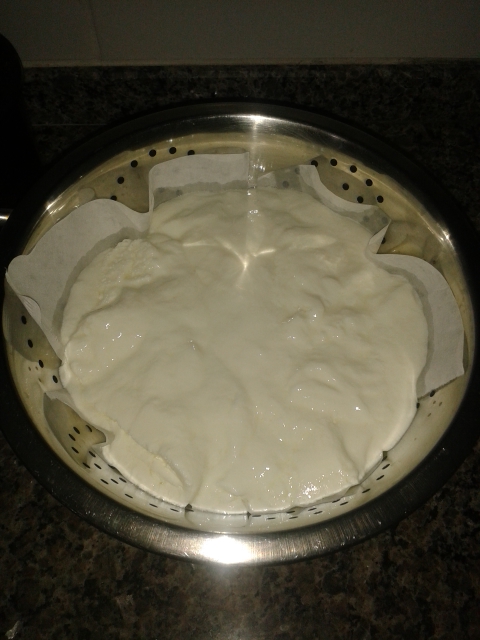 6- Para transformar a coalhada fresca em coalhada seca é preciso "filtrar" o líquido. Para isso você pode usar um pano ou qualquer outro material que não se desfaça em contato com a água. Usei um escorredor de macarrão coberto com coador de papel de café. Deixe por pelo menos mais 12 horas "secando" na geladeira (Lembrando que quanto mais tempo ficar neste processo, mais seca ela ficará. Ajuste o tempo a sua consistência de preferência).