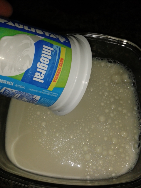 3- Quando atingir a temperatura desejada, coloque o leite num recipiente que tenha tampa, despeje o iogurte natural e misture bem.