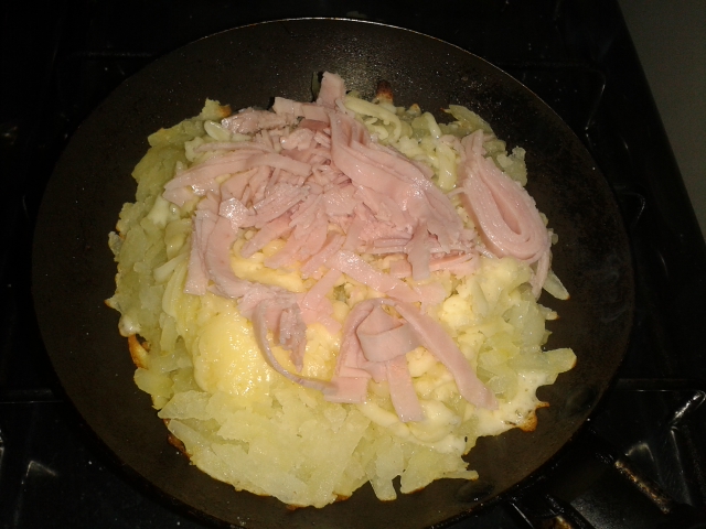 6) Coloque mais batata para cobrir a parte superior e deixe fritar até que o lado de baixo esteja dourado.
