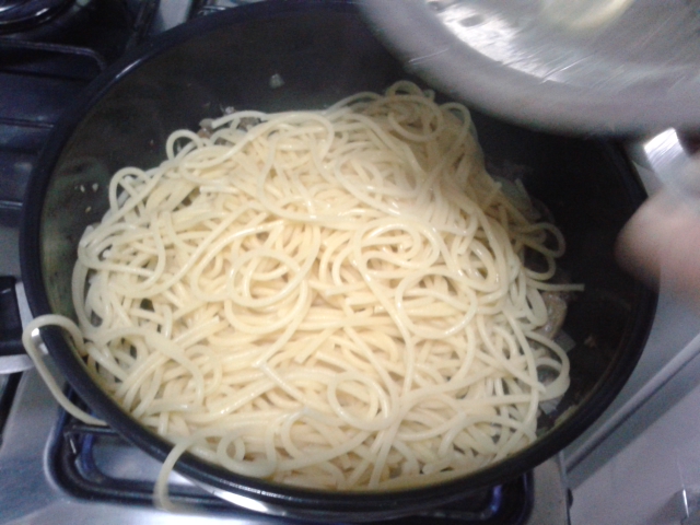 10- Leve novamente a panela com o cogumelo ao fogo, adicione o macarrão e misture bem.