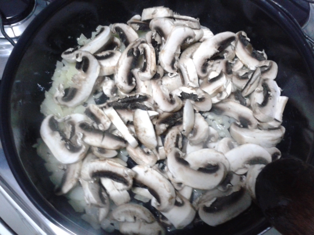 5- Quando a cebola estiver "transparente", coloque o alho, o cogumelo de Paris e um pouco de ervas de Provence.