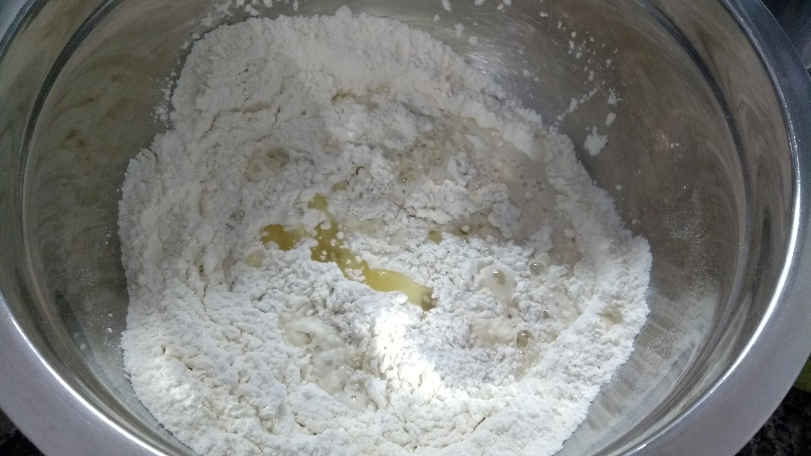3- Adicione o fermento dissolvido na água, o óleo e o leite (que deve estar em temperatura natural). Misture bem e sove a massa até obter uma massa que não gruda na mão e uniforme (Adicione um pouco de farinha, se necessário).