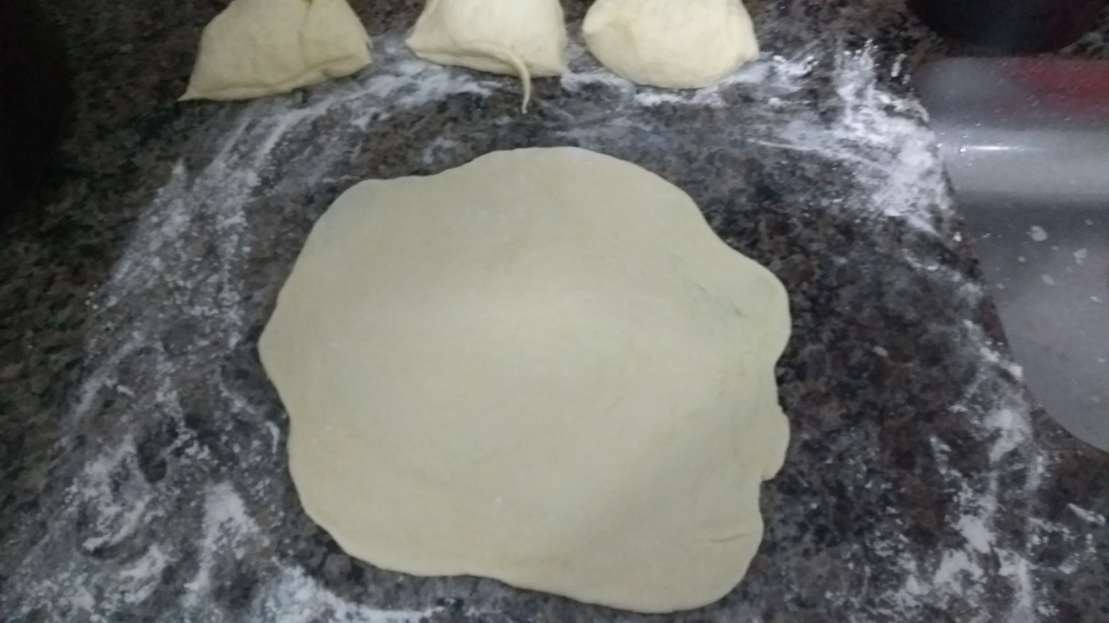 7- Após a massa descansar os 30 minutos adicionais, coloque-a numa superfície polvilhada com farinha e corte-a em 4 pedaços iguais.