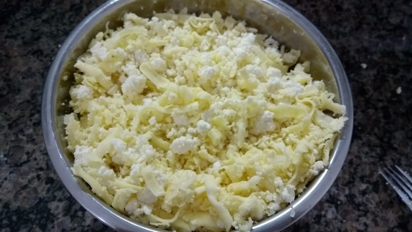 6- Enquanto a massa descansa, prepare o recheio. Triture a ricota com a ajuda de um garfo e misture com a muçarela ralada. Pode colocar uma pitada de sal, se necessário.