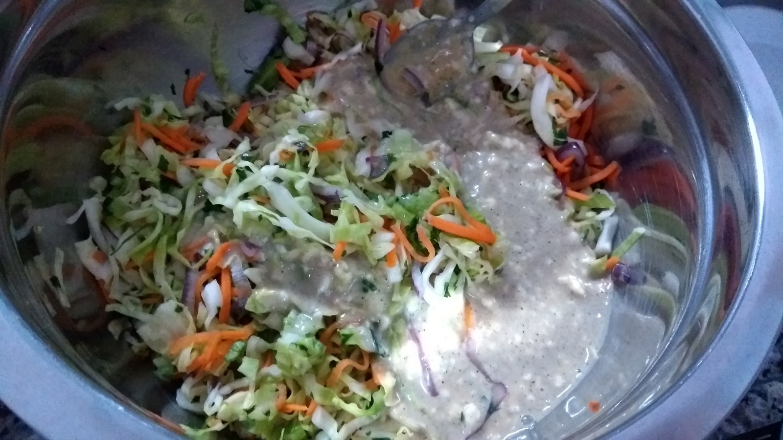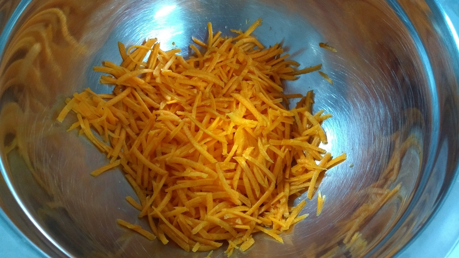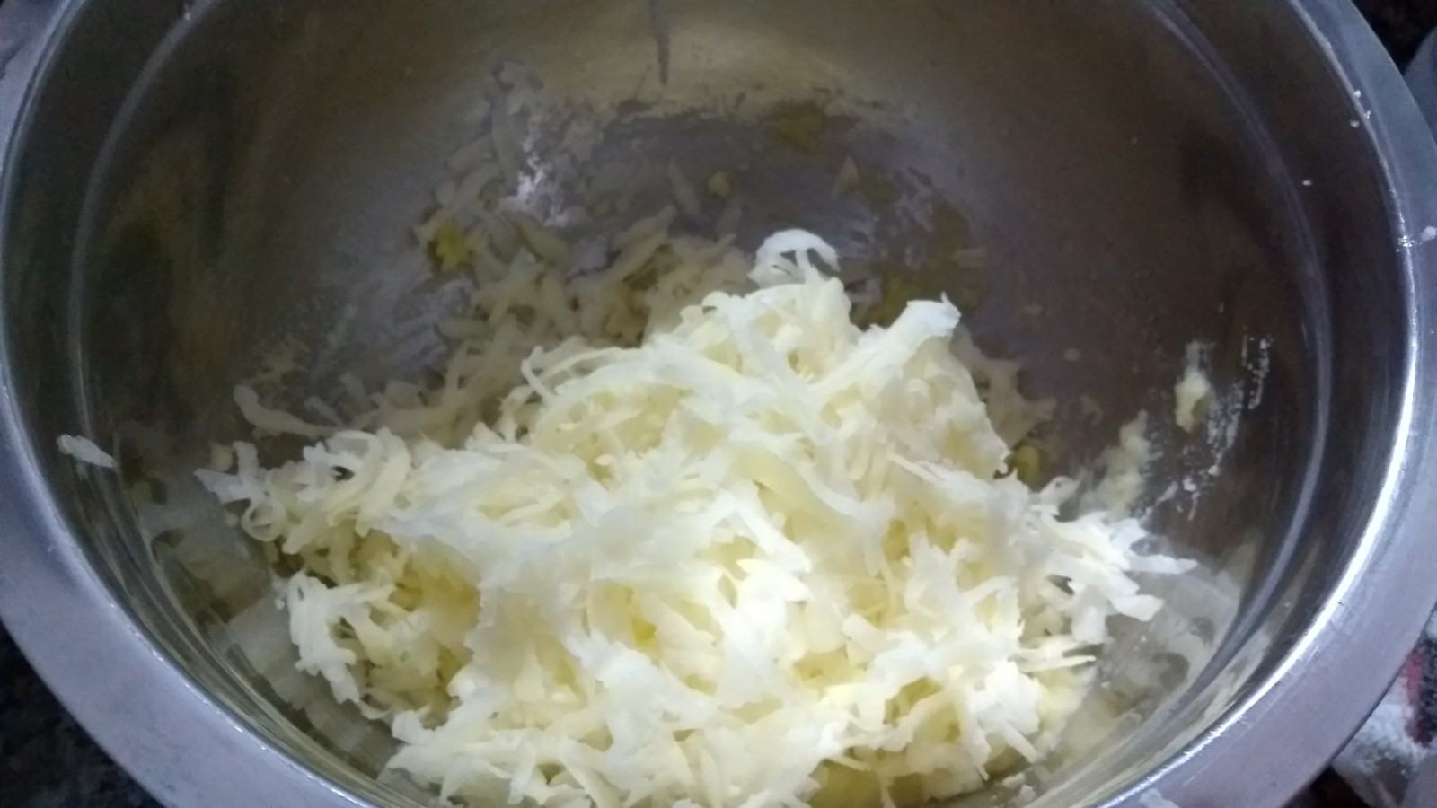 3- Rale as duas batatas restantes com um ralador ou mandolin no recipiente com água e limão (O suco de limão vai prevenir que a batata escureça).