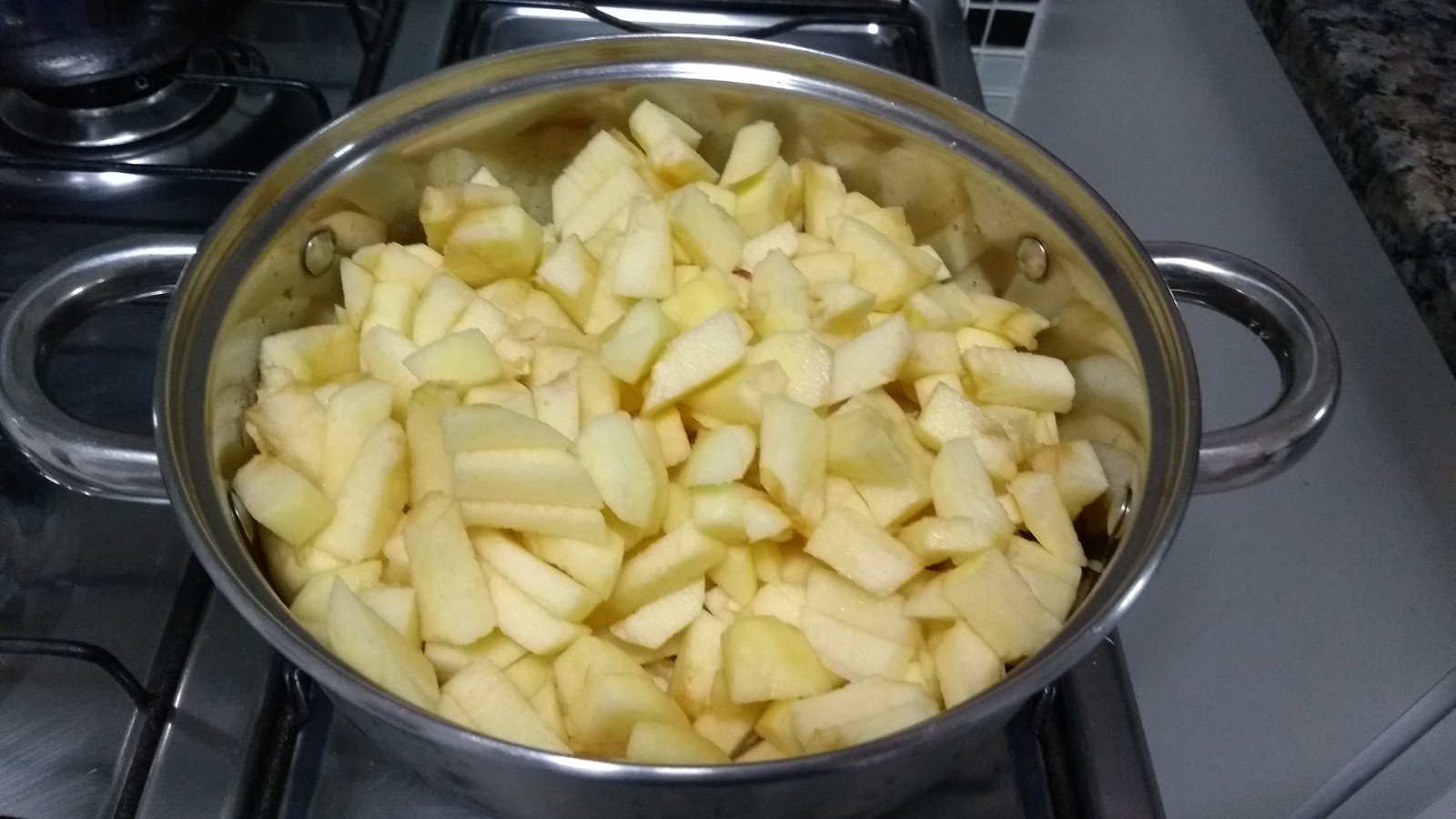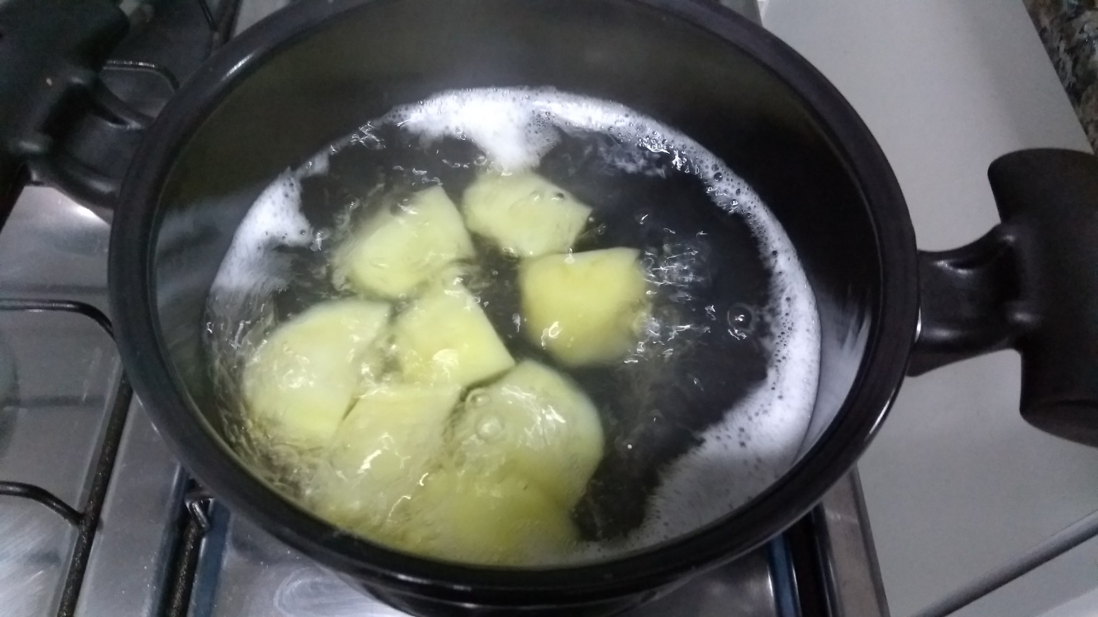 1- Descasque as 3 batatas. Reserve duas batatas e corte a última batata em cubos grandes e leve ao fogo com água suficiente para cobri-la. Retire do fogo quando já estiver bem mole (Teste com um garfo).